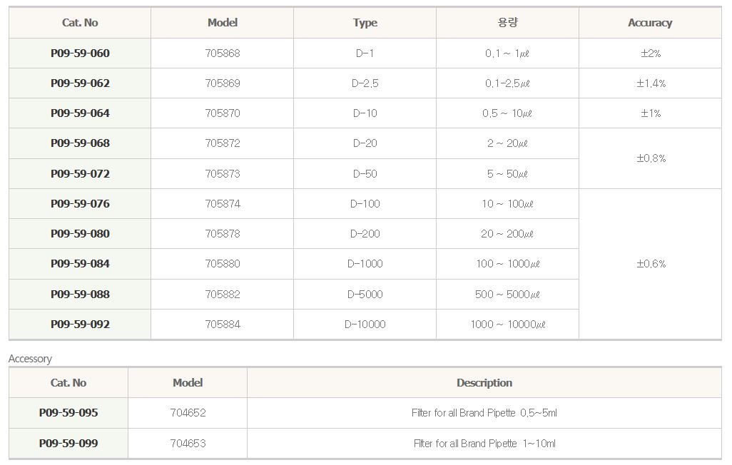 - D-10000 : Brand 또는 Gilson®, Eppendorf® Tip과 사용 가능함