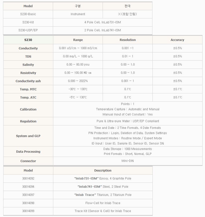 S230-Basic” 기본구성품, InLab731-ISM 전극, Guide to Conductivity & DO, 1회용 buffer 2 (1413 uS/cm, 12.88 mS/cm)