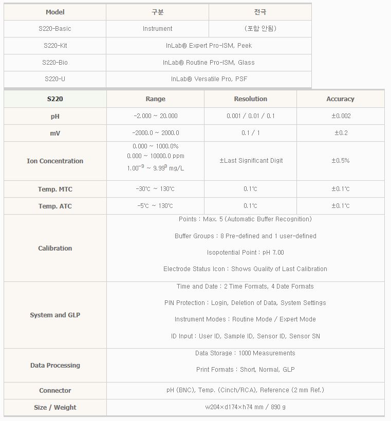 2) S220-Kit : “S220-Basic” 기본구성품, Expert Pro-ISM 전극, pH 측정가이드, 1회용 Buffer 2개 (pH 4.01, 7.00, 9.21 and 10.00)